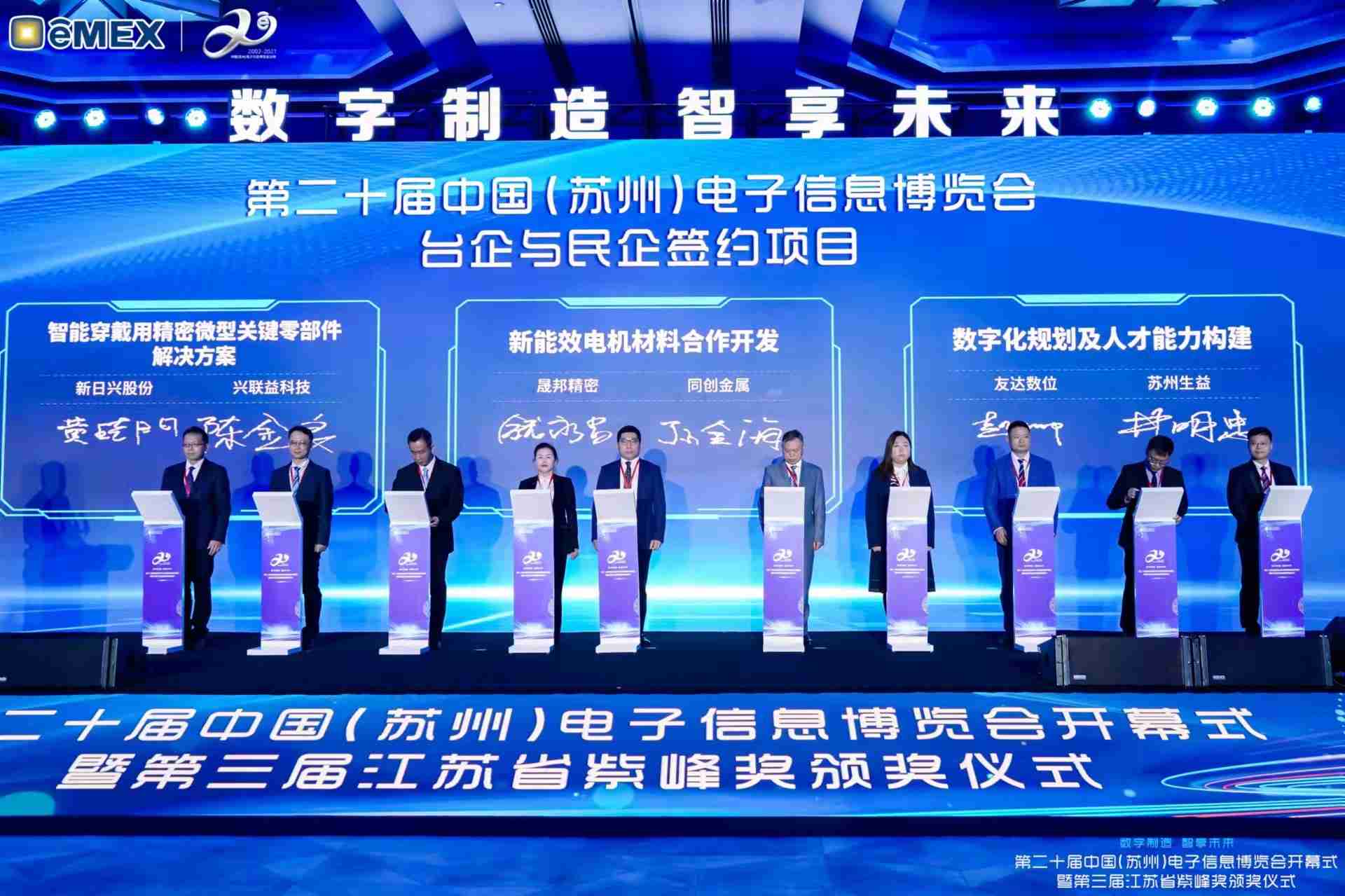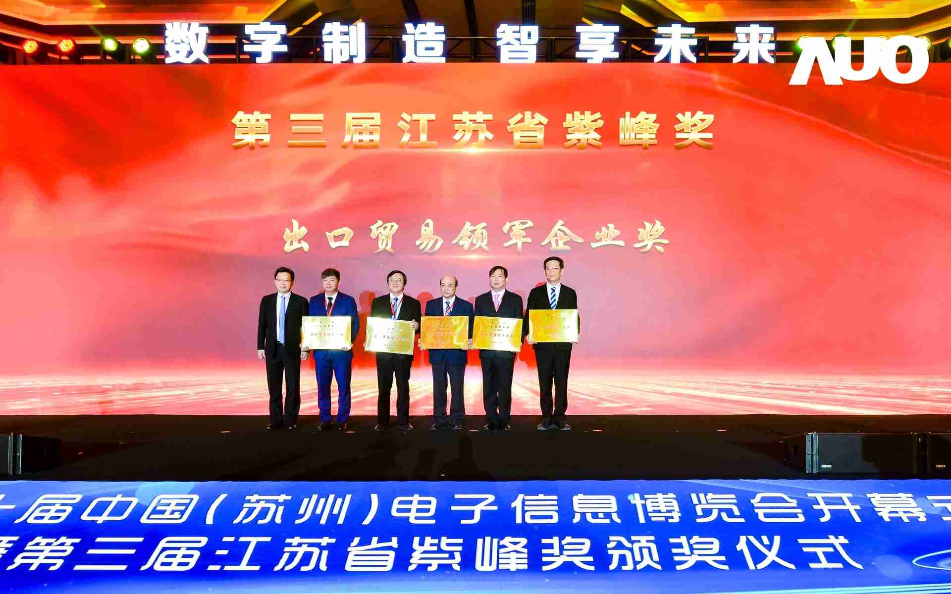 电博会开幕式当天也是第三届江苏省紫峰奖颁奖仪式,,,省台办、、工信厅、、、商务厅、、、苏州市相关领导均出席并颁奖。。。。该奖项为表彰对江苏高质量发展做出积极贡献的在苏企业,,,由江苏省政府专门设立。。。。PG国际光电 (苏州) 总经理郭振明代表上台领奖,,,,这也是PG国际苏州连续三次蝉联紫峰奖 出口贸易领军企业奖。。。。PG国际数位总经理赵丽娜女士,,,,也参与本次开幕式,,,,上台为本地化赋能签署战略合作协议,,,,将优质服务资源集合、、、、下沉到更多细分行业,,,为更多地区的制造企业提供数字化转型服务。。。。